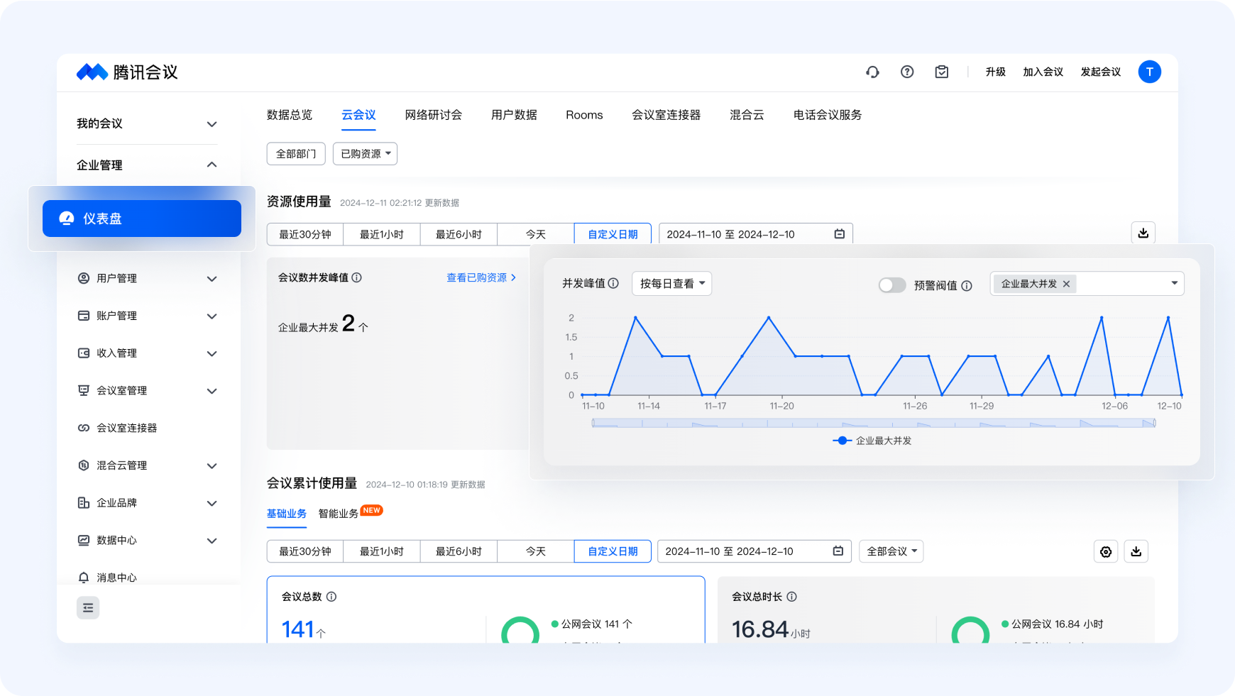 腾讯会议为管理员提供专业的可视化仪表盘,将企业所有的会议资源的使用情况进行统计分析,并以图表的形式呈现,以便管理员更好地查询、管理会议资源。
