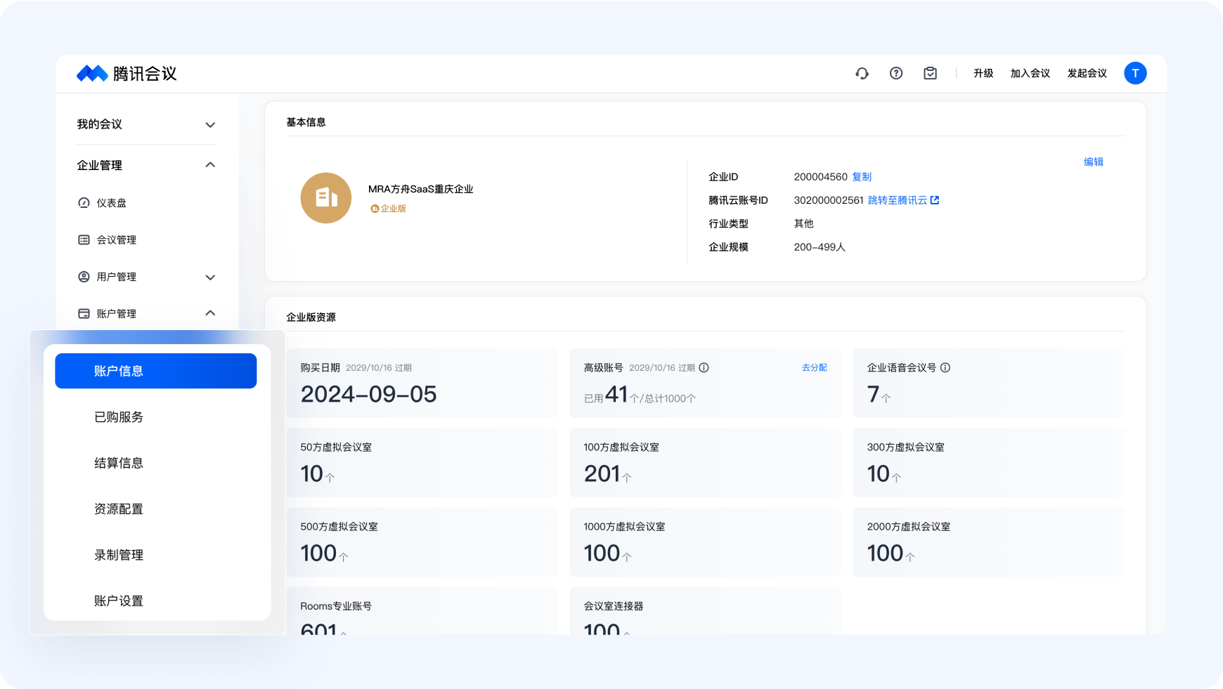 作为管理员,您必定需要对企业当前会议资源使用情况进行了解。您可以前往企业管理后台【账户管理】,可以看到本企业账户的资源购买和使用的基本情况。